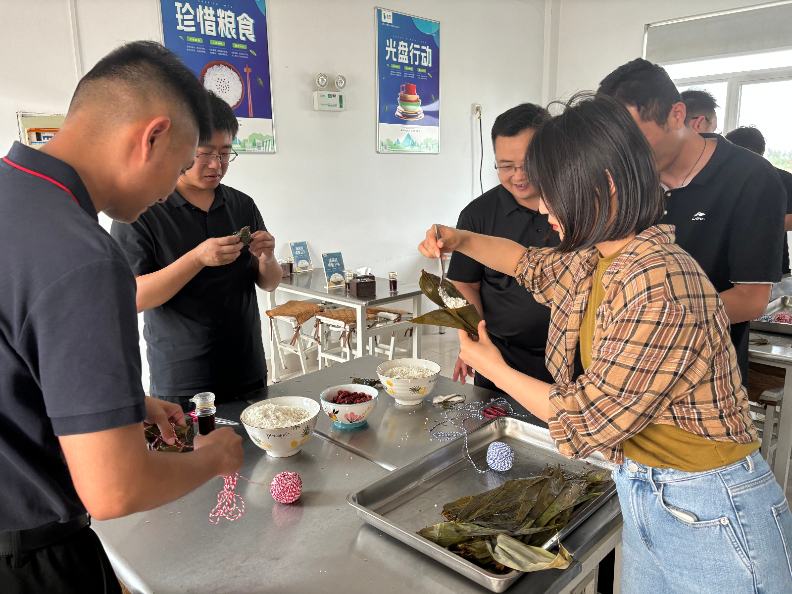在一片祥和的節(jié)日氛圍中,大家圍攏在桌旁,邊學(xué)邊練,互相協(xié)作,折粽葉、填糯米、裹葉子、扎線.......一道道工序有條不紊,忙得不亦樂(lè)乎。一張張翠綠的粽葉在手中翩翩起舞,一個(gè)個(gè)有模有樣的粽子迅速成型,大家手把手傳承著端午節(jié)的傳統(tǒng)文化,共同感受著中華傳統(tǒng)文化的魅力。